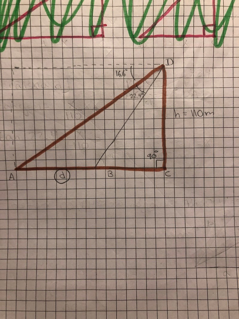 Har helt fastnat på denna uppgift där jag ska beräkna sida d. Tänkte först använda mig av vinkeln 51för att beräkna tangens till vinkeln eftersom jag har höjden och då får fram sida BC. De står dock helt still om hur jag fortsätter därifrån.