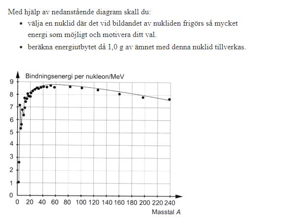 Jag tänker mig att det är Fe (masstal 56) men vet ej hur jag ska beräkna energiutbytet