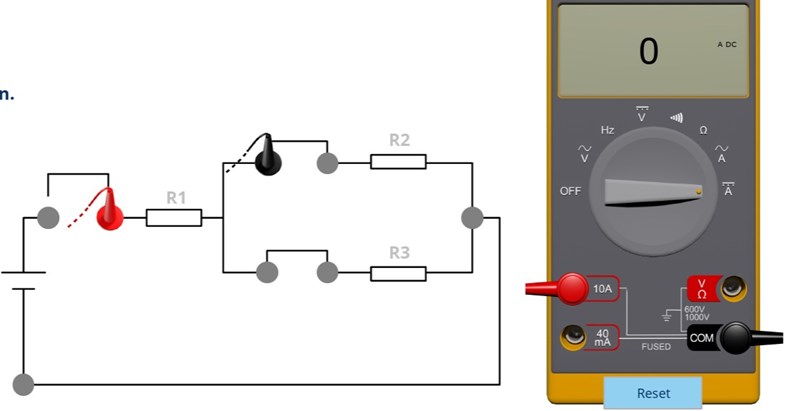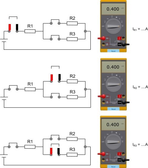 När jag sätter den röda på 10 A och mäter ström utan byglarna i så blir det 0 på alla. Ändrar jag till att ha det som på bilden nedan får jag de värdena jag redan har skrivit. Mäter jag över 2 motstånd får jag dessa värden. Vet dock inte om det är till stor hjälp