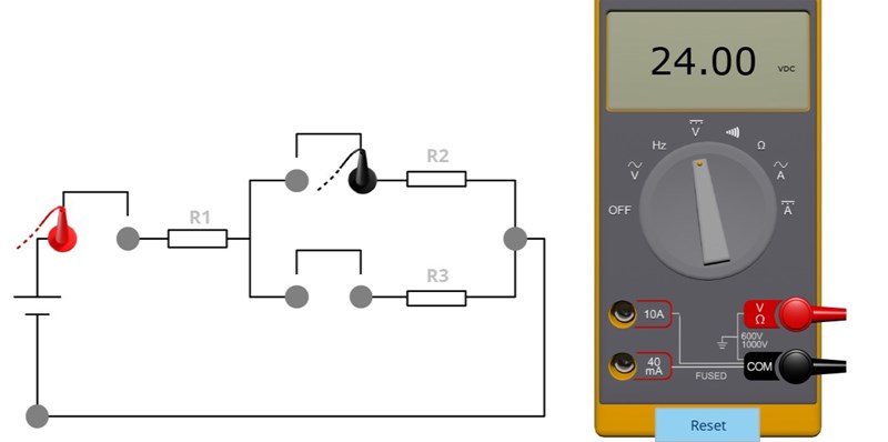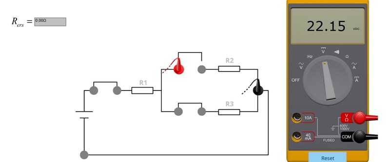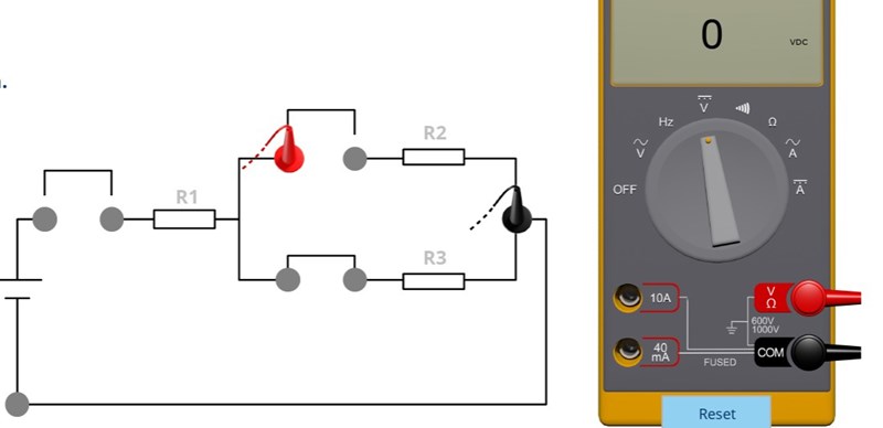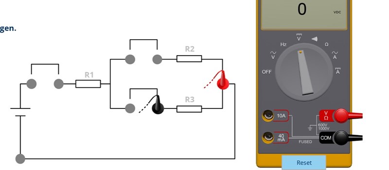 Voltmetern däremot är "tvärtom". Den har oändligt hög inre resistans. Den mäter spänning utan att släppa igenom någon ström.