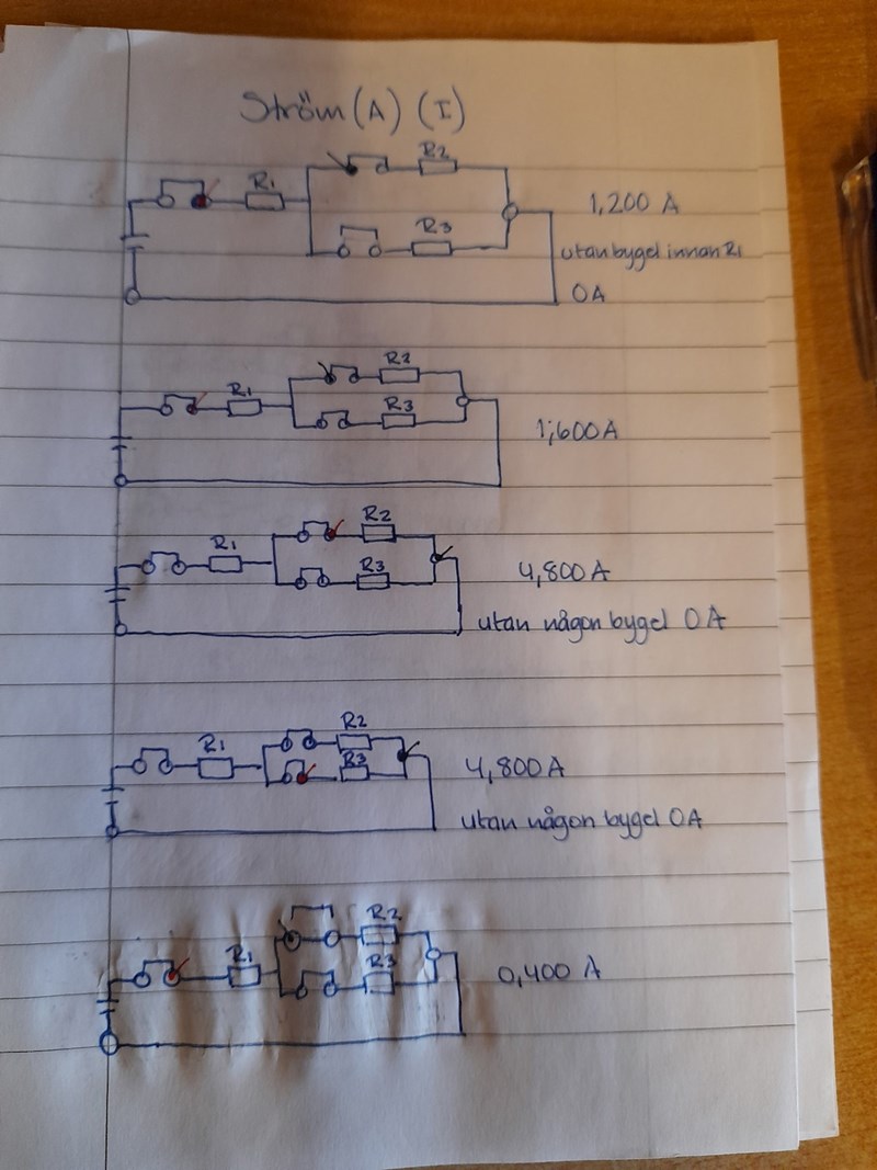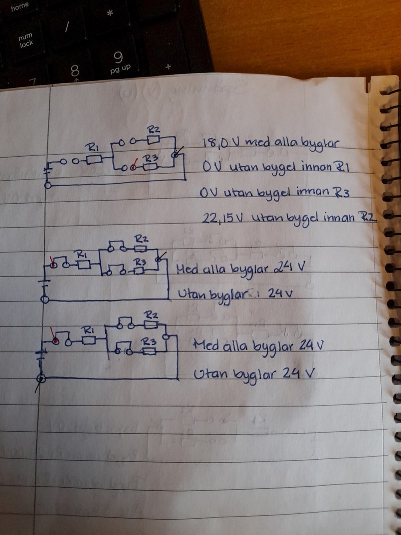 Vad du behöver göra är två spänningsmätningar och tre strömmätningar. Det hade varit bra om vi suttit bredvid varandra och gjort detta men jag ska försöka rita och berätta i stället så hoppas jag det blir nästan lika bra.
