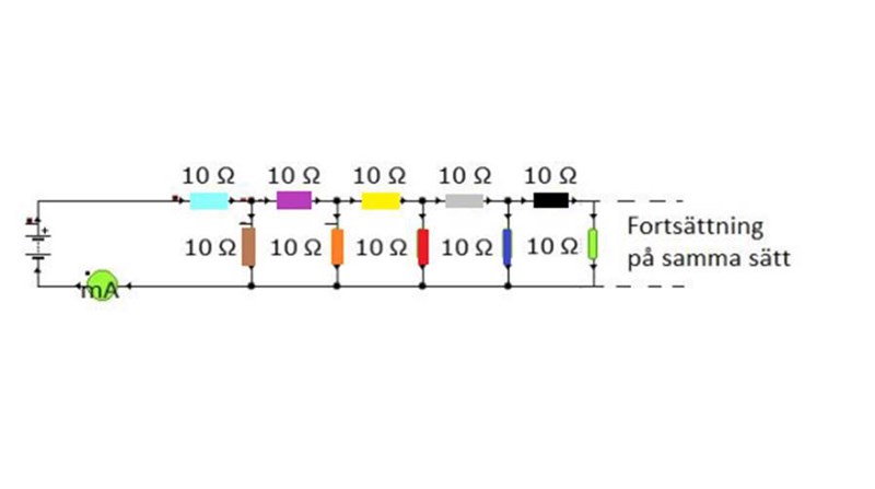 Om du lägger till två motstånd på 10 ohm i början (till vänster) i kedjan och kallar allt till höger för R så får du 10 ohm i serie med (10 ohm parallellt med R ohm) vilket det här betyder: 10+10//R = R.
