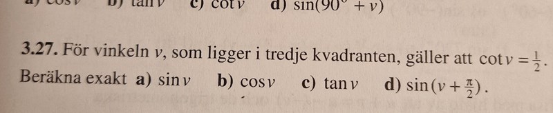 Hur gör man när man vet cot v men vill ta reda på sin v? Och man vet att cot v ligger i tredje kvadranten men vet inte exakt hur ska jag utnyttja den informationen. Obs får inte använda miniräknare.