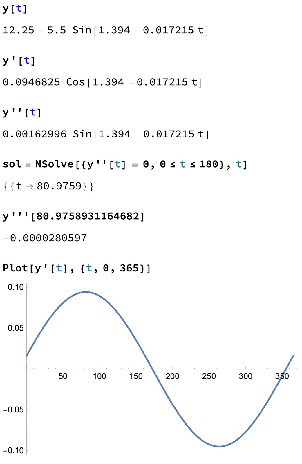 Om det hade varit en cosinuskurva och du hade velat beräkna när den ökade som snabbast skulle du behäva ta dera på när sin(0,017215x-1,394)=-1 eftersom derivatan för cosinus är minus sinus.
