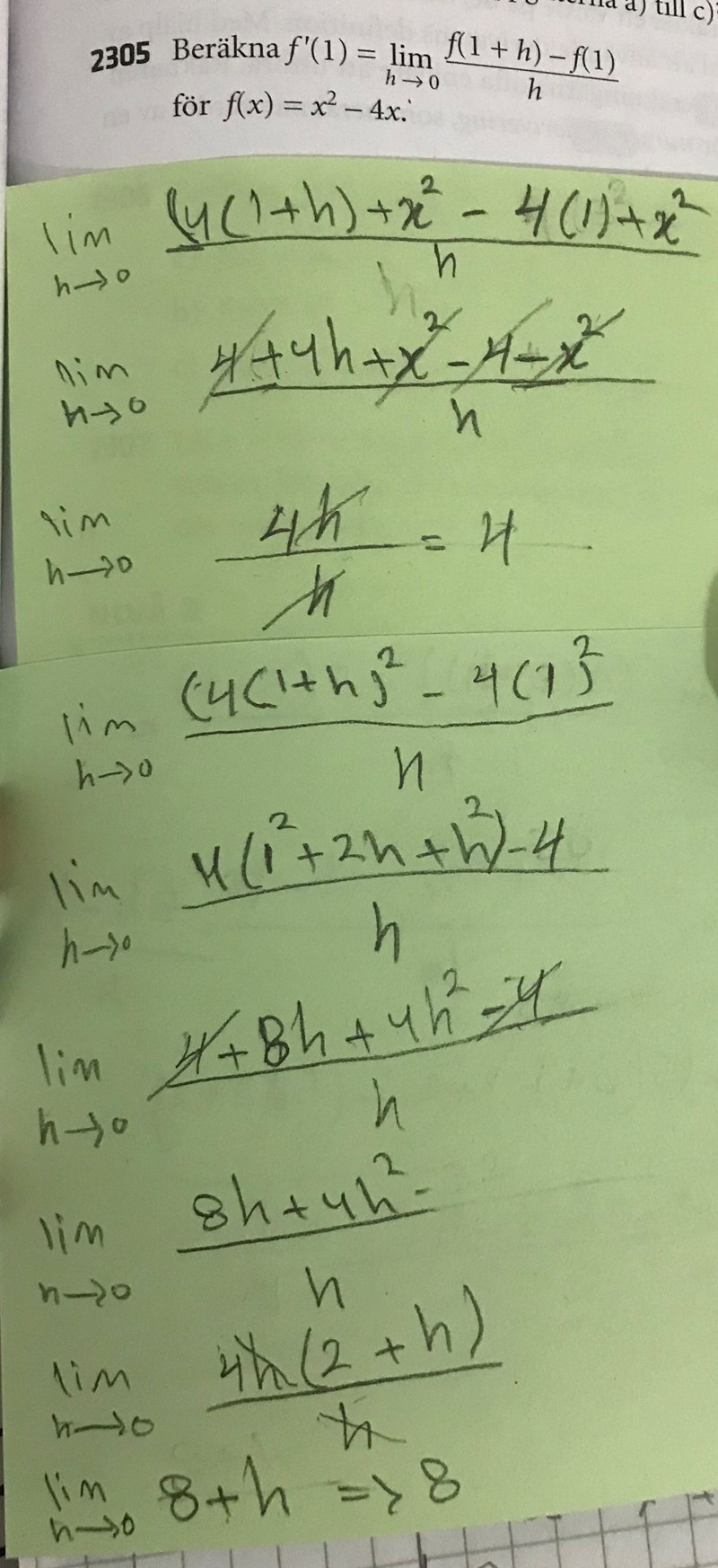 En som jag inte förstått, du har skrivit (((1+h)^2 - 4(1+h) ) - (1^2 -4*1))/h. eller