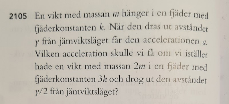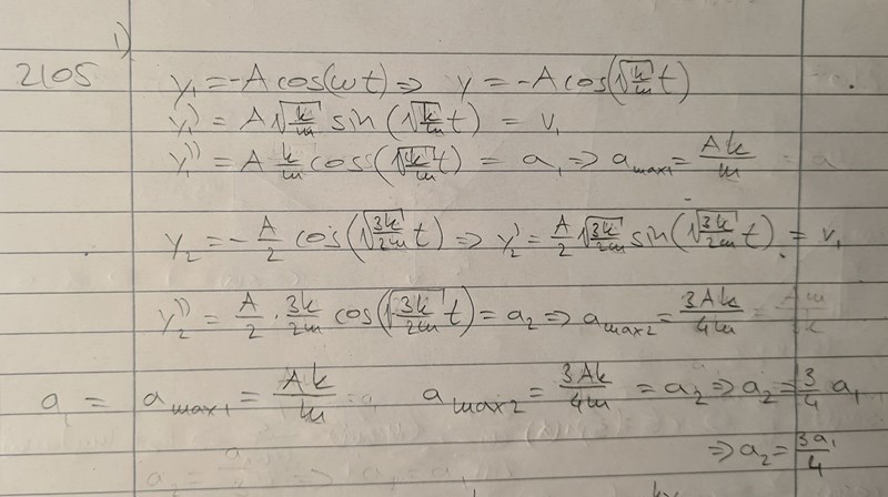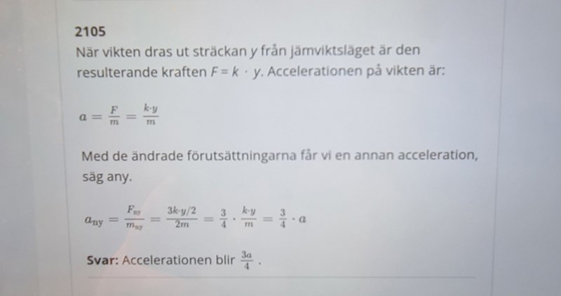 I denna uppgift har jag tillämpat formeln för harmonisk svängningsrörelse för att beräkna accelerationen för båda vikterna, dvs skapa ett generellt uttryck för acceleration för båda vikterna. Kan man använda sig av detta tillvägagångssätt, dvs. är det korrekt?