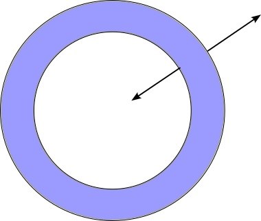 Det yttre skalet har radien , det inre skalet har radien . Räkna på flödet genom ett skal i taget och lägg sedan ihop flödena ut ur det markerade området.