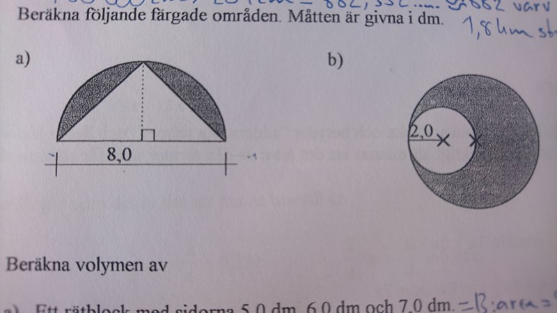 Jag tänker såhär... Att först räkna ut arean av triangeln för att sedan också räkna ut arean av cirkeln som jag dividerar med 2 på grund av att det är en halvcirkel. Arean för halvcirkeln tar jag och subtraherar bort triangelns area för att sedan få svaret. Men det blir inte rätt hur jag än vrider på det.. Vad är det jag gör fel? Kan någon hjälpa mig och ta allt från början?