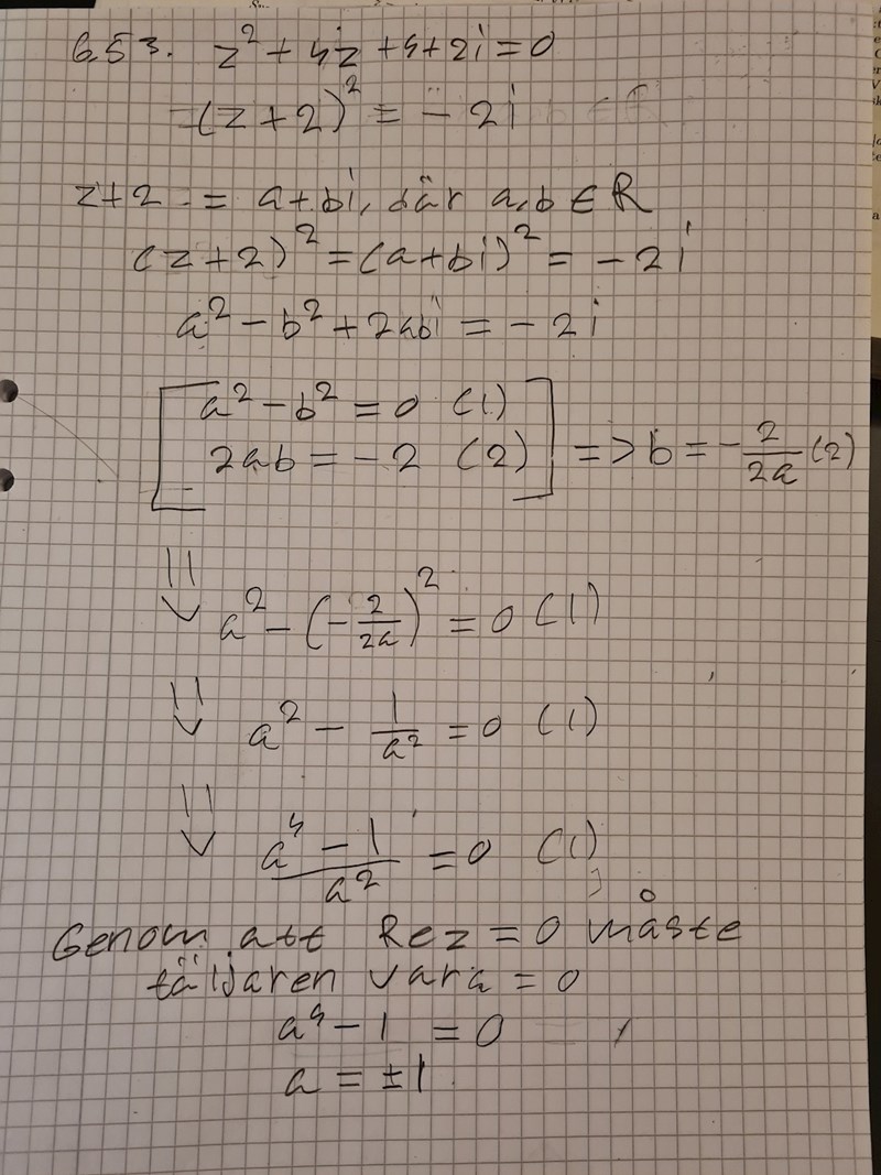 Jag får att a är = -1 eller 1. Och detta verkar ju stämma, för Re(z) = 0. Sedan stoppar in a i ekvation (2) och får att b = -1 eller 1 och detta verkar stämma också för Im(z) = -2. Men nu vet jag inte hur jag ska fortsätta.
