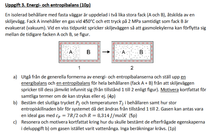 Specifikt håller jag på att studera uppgift (b). Eftersom en ideal gas följer sambandet och vi vet att den sammanlagda, interna energin är fixerad under hela transformationen vet vi att . Enligt sambandet vet vi dessutom att trycket halveras då volymen tvåfaldigas. Med andra ord har vi . Nu gäller det att bestämma entropiskillnaden och det är här jag har lite problem.