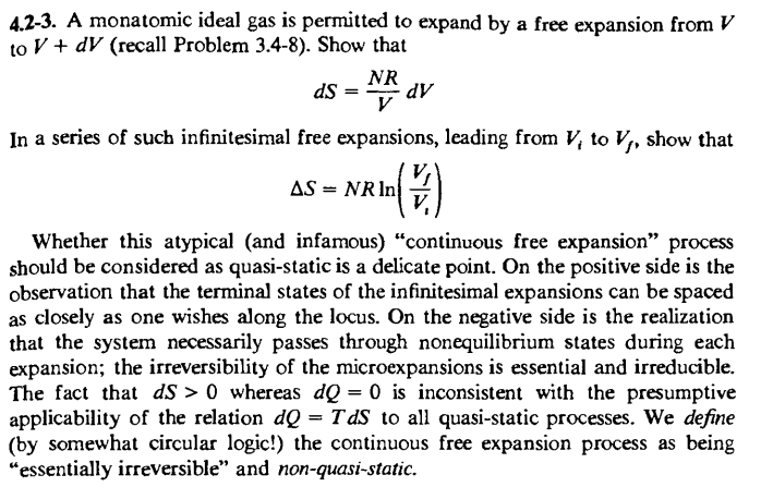 Här blir man ju faktiskt lite rädd. Callen verkar tycka att det problematiskt att medan så att , varför han menar att denna process inte borde inordnas som kvasistatisk. Men jag förstår inte riktigt vad problemet med detta är. Varför skulle för alla kvasistatiska processer? Kvasistatisk innebär ju bara att systemet är i jämvikt under hela processen (mer tekniskt att den följer en kontinuerlig kurva i sitt konfigurationsrum) och det gör ju uppenbarligen den här processen (per antagande). Är det inte snarare så att kanske helt enkelt inte gäller för alla kvasistatiska processer? Om det är meningen att expansionen från till ska ske instantant (alltså inte kvasistatiskt) gäller ju knappast ...