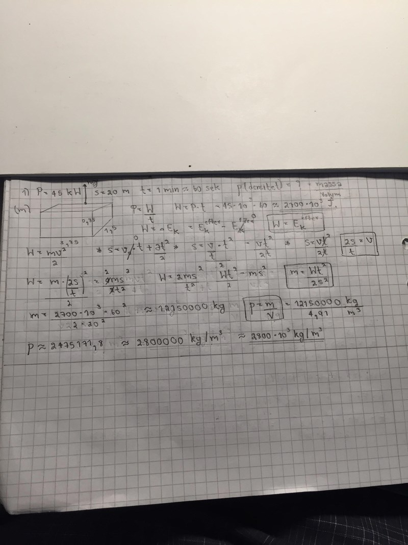 En lyftkran på ett bygge har en dieselmotor som utvecklar en effekt på 45 kW. Lyftkranen lyfter en tung betongkloss 20 meter upp i luften i en minut. Klossen har en bred, längd och höjd i angiven ordning på 3,85m, 1,5m och 0,85m. Beräkna klossens densitet.