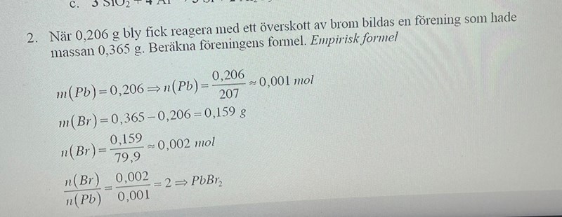 har en uppgift här. Förstår att man ska räkna ut substansmängden för de båda ämnena men hur kommer der till att man dividerar dom med varandra för att få 2? Vad betyder denna tvåan?