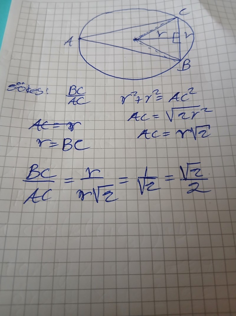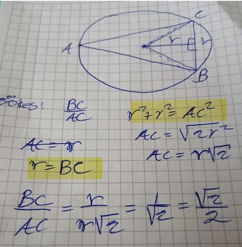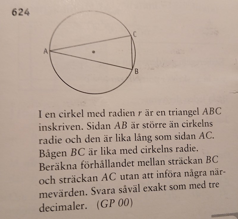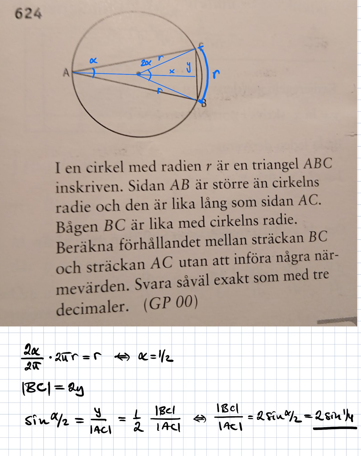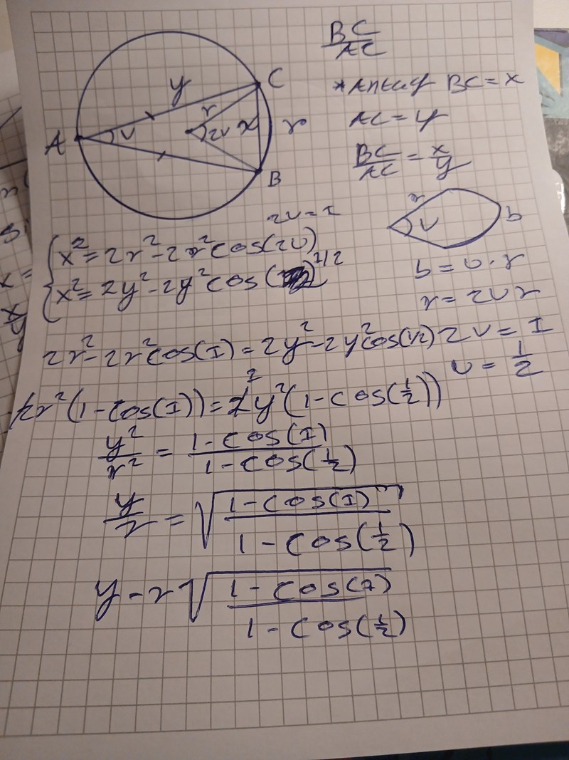 Den första förstår jag inte varifrån du har fått och den andra är bara en missuppfattning, det är bågen BC som är lika med r, inte kordan BC.