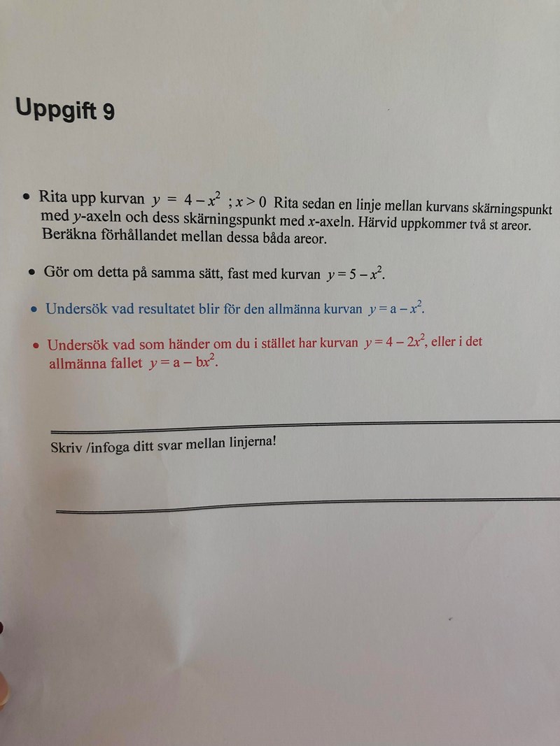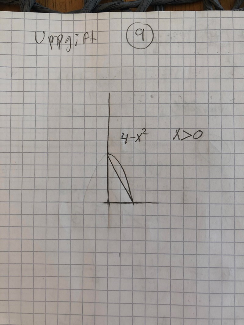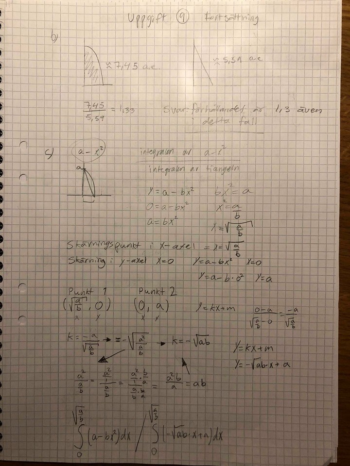 I punkt 3, ska jag undersöka vad resultatet blir för den allmänna kurvan y=a-x^2. Jag förstår att integralen av kruvan a-x^2 ska delas med integralen av triangeln, men förstår inte hur jag ska skriva ett uttryck för integreringsgränserna? Altså triangelns bas och funktionens ena nollställe?