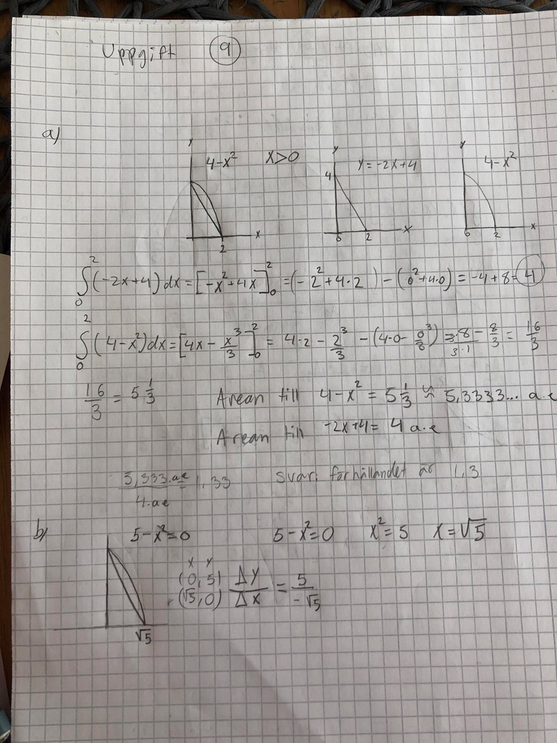 I punkt 2, när jag ska göra samma sak fast med kurvan 5-x^2, måste jag först ta reda på kurvans positiva nollställe, så får jag det till roten ur 5. Sedan fastnar jag när jag ska ta redan på vad den linjära linjen har för k-värde. Jag tar punkterna 0.5 och roten ur 5, 0 och gör dela y genom delta x, men får 5/- roten ur 5, kan jag använda det tal som k-värde?