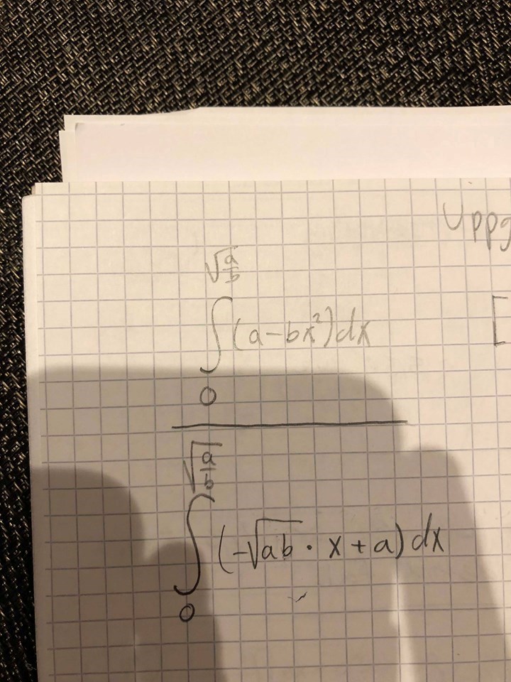 grankvisten skrev:På sista raden i bild ovan har du ju två integraler delade med varann. Integralen i nämnaren är onödigt komplicerad. Du vet ju att den är en rätvinklig triangel, dvs arean = bh/2. Höjden är ju given, men även bredden. Tycker integralen i täljaren ser bra ut.