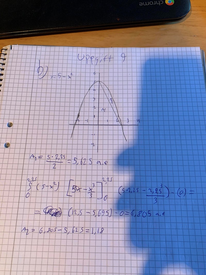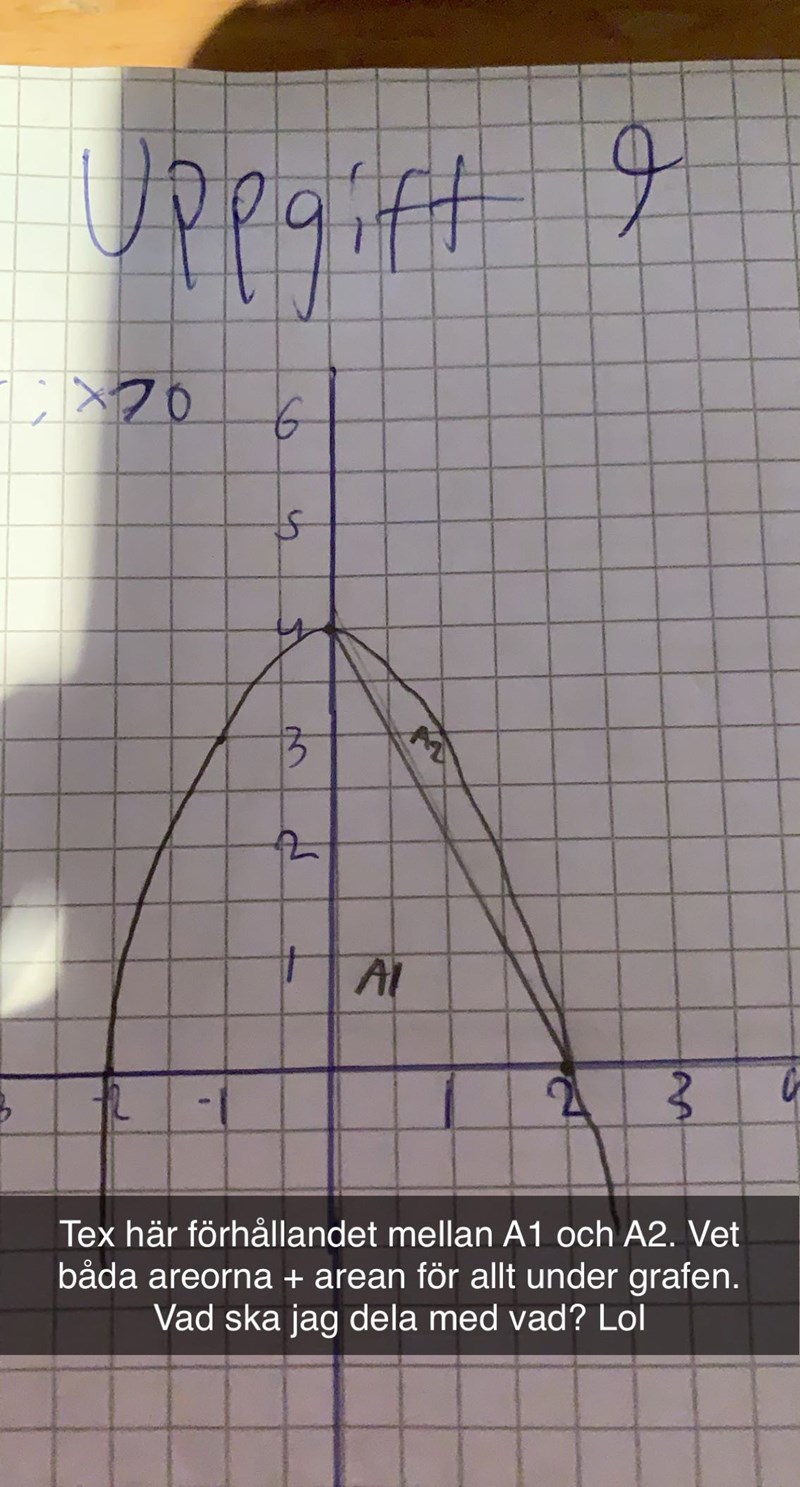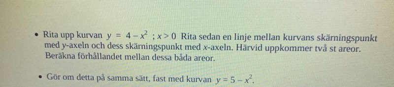 Andra frågan där jag ombeds gör samma sak fast med y=5-x^2 gör jag såhär. Men känns som jag missar nåt eller funkar detta? Och sen då dela A1 med A2