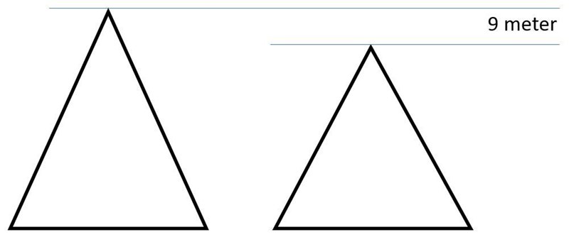 Jag började med att räkna ut Volymen på hela pyramiden, vilket är ( 230 m ∙ 230 m ∙ 146,5 m ) / 3 ≈ 2 583 283,333 m³. Sedan ska jag ta bort 9 m från toppen och beräkna volymförlusten, men jag vet inte riktigt hur jag ska göra. Jag vet ju inte basytans area på den här lilla pyramiden med höjden 9 m. Hur ska jag tänka härifrån?