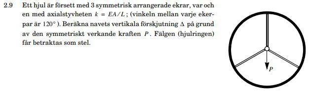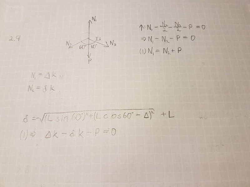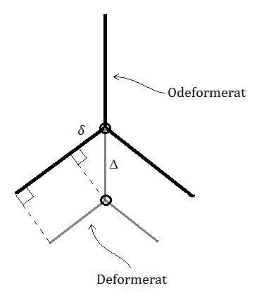 δ ska representera förlängningen i den vertikala stången och Δ ska representera förkortningen av en sned stång. Kom fram till detta uttryck men misstänker att det är överdrivet komplicerat, vet ej hur jag löser ut Δ från ekvationen. Undrar även om jämviktsekvationen verkligen stämmer då vinkeln kommer öka från 60°?