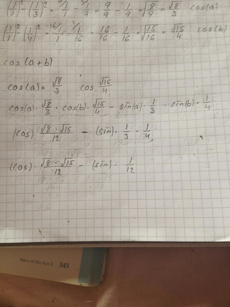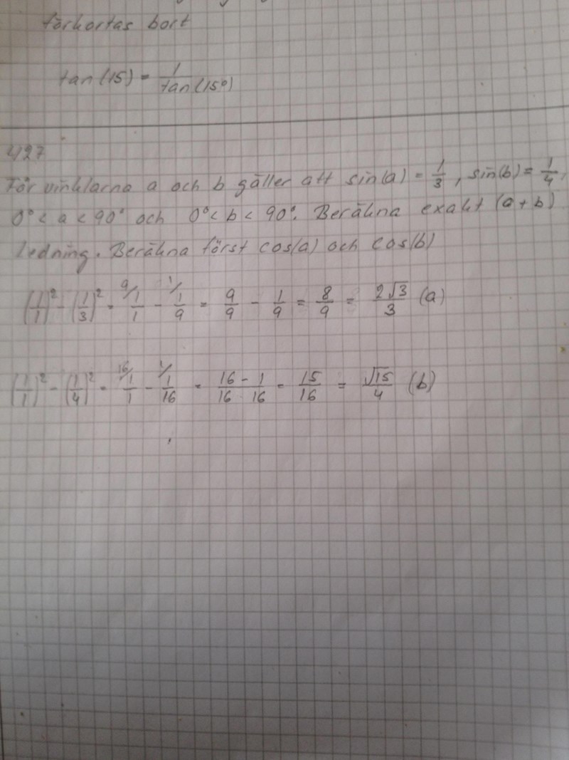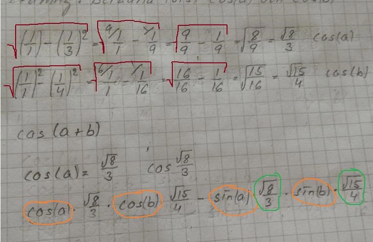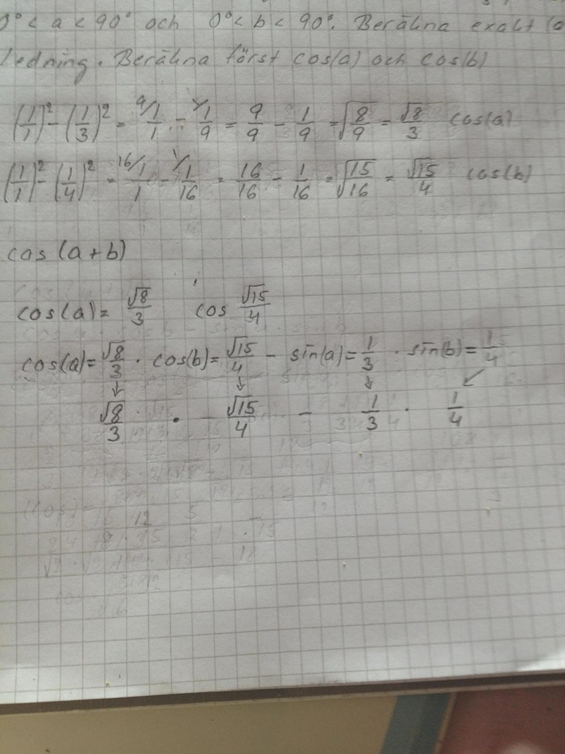 - Vid det gröna så verkar du satt in värdena för cos(a) och cos(b), men det är väl värdena för sin(a) och sin(b) som du tänkt sätta in där?