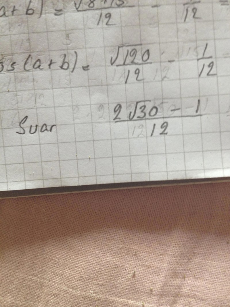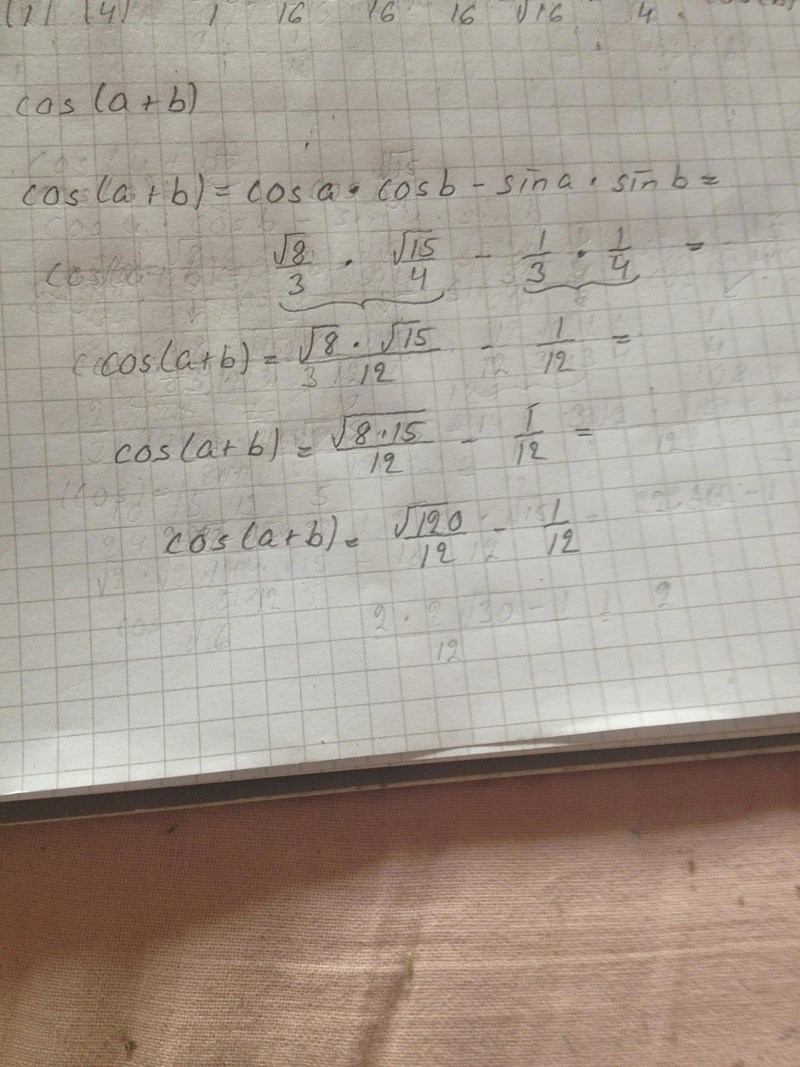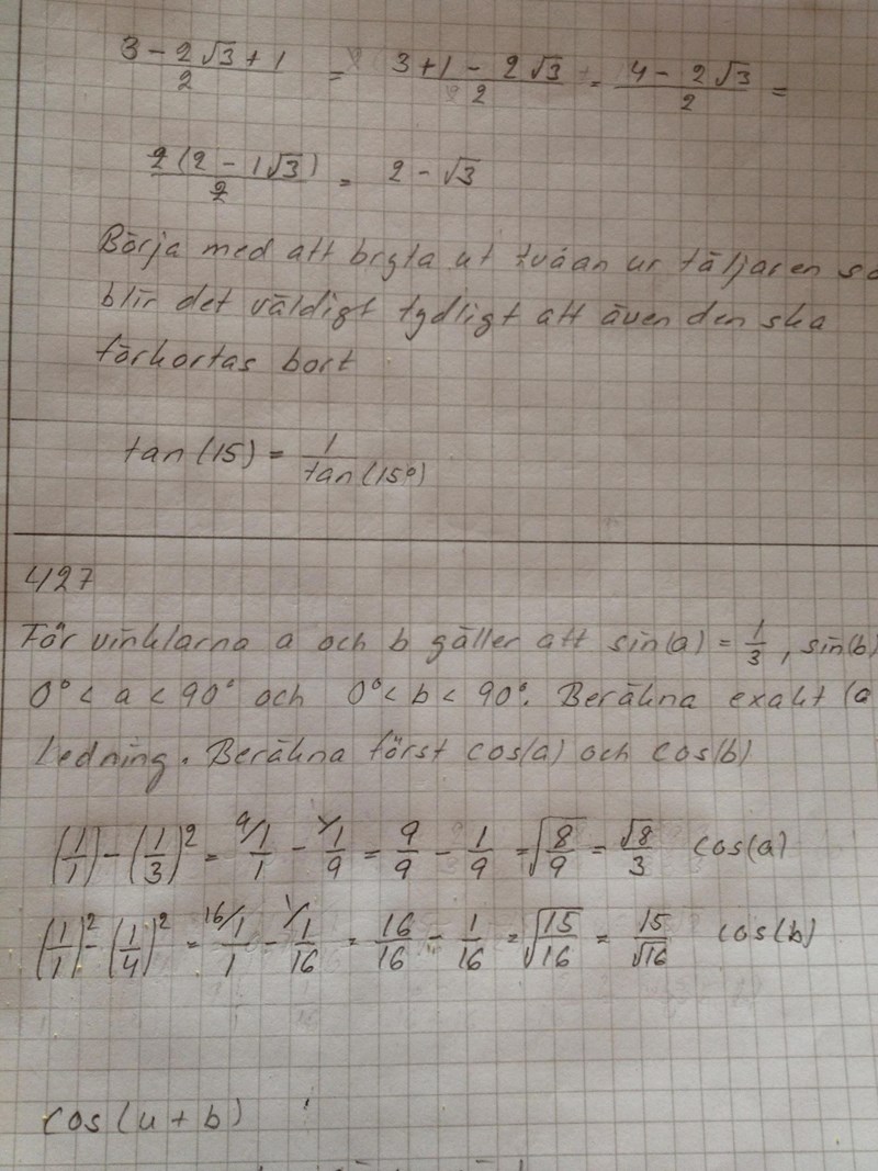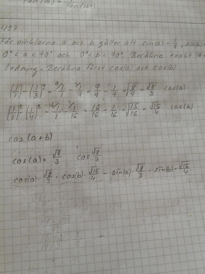 - Vid det gröna så verkar du satt in värdena för cos(a) och cos(b), men det är väl värdena för sin(a) och sin(b) som du tänkt sätta in där?