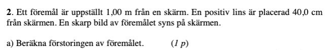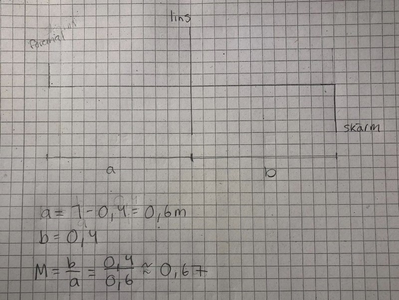 Där a ska vara avstånd mellan objekt och lins och b är avståndet mellan lins och bild.