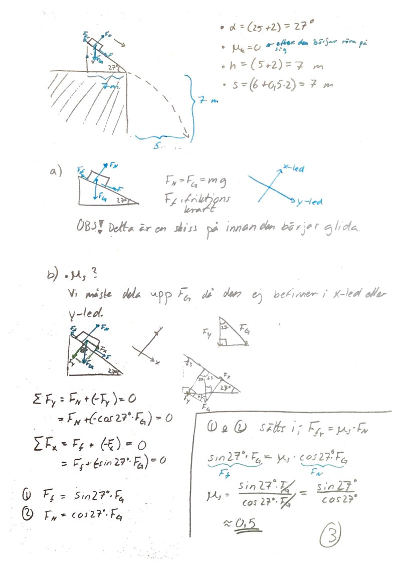Beräkna friktionskoefficienten och längden som slädet får när den åker nedför en backe med 27 grader