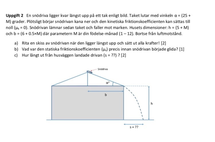 Prova! Och sedan kan du prova att lägga y-axeln pekandes nedåt, med y=0 där snön lämnar taket, och y=7 i marknivå. Då blir utgångshastigheten och accelerationen istället positiv. Men du kommer naturligtvis fram till samma svar.