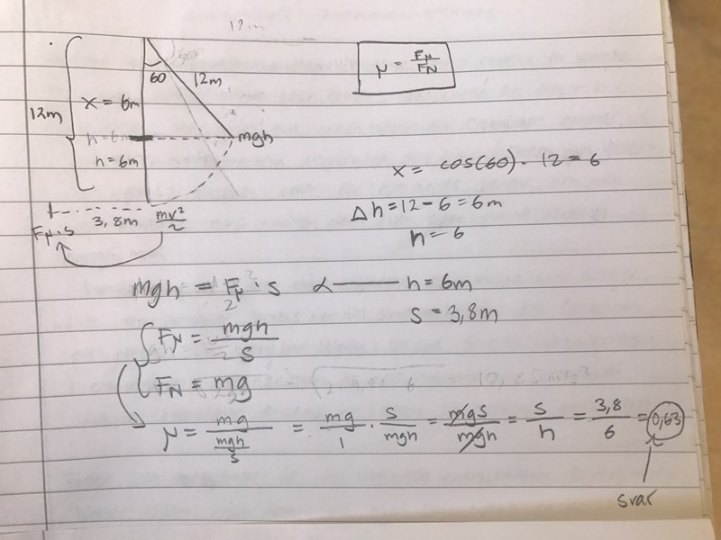 Smillasmatematikresa skrev:Fn är normalkraften och då tänkte jag att den är lika stor som tyngdkraften alltså mg. Fq har jag brutit ut från ekvationen där jag likställer friktionsarbete med lägesenegerin i början. Sedan tänkte jag att friktionstalet är ett förhållande där jag kan dividera båda dess uttryck med varandra som dessutom gör att jag blir av med massan som är okänd. Jag kommer faktiskt inte på vart jag har gjort fel, men jag förstår vad du menar med att förhållandet blir orimligt.