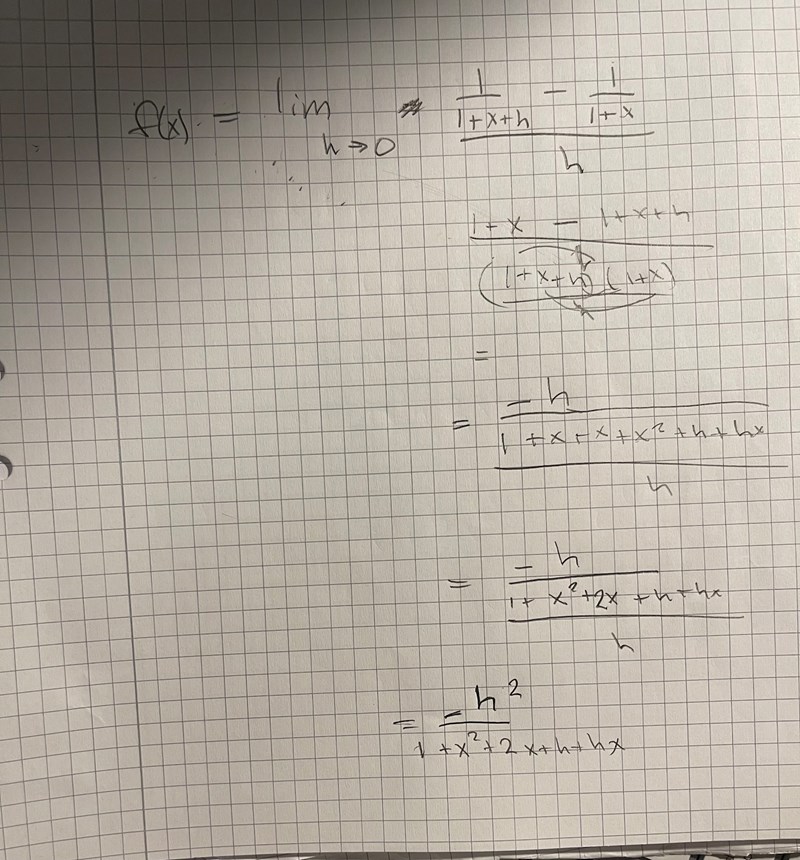 Men då får jag -1/(1+x^2+2x) om h går mot noll.