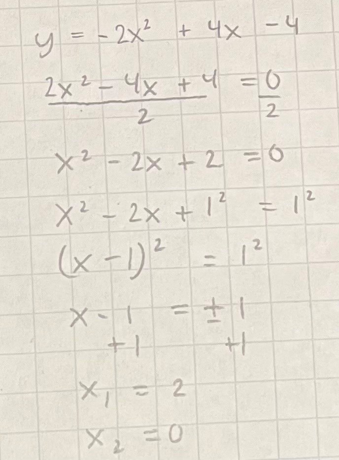 På b uppgiften gjorde jag så här (se nedan) och fix att x1 = 2 och att x2 = 0. Men i facit så står det att uppgiften saknar nollställen. Hur kommer det sig?