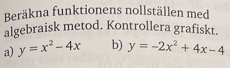 Jag undrar hur jag räknar upp uppgifterna nedan? Hur löser man dem algebraiskt? Det enda jag vet är att funktionen har nollställen om y=0, men sen vet jag inte hur jag ska göra.