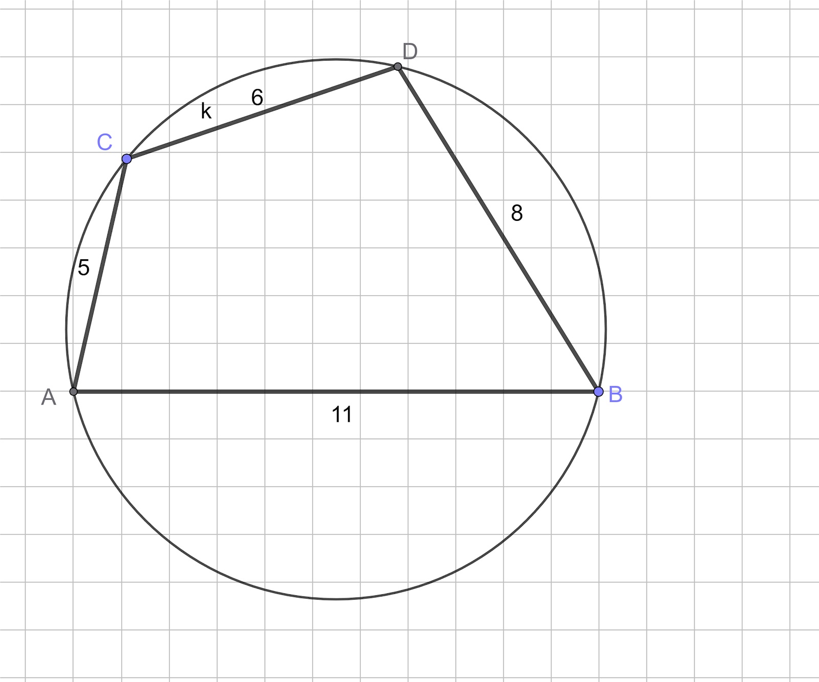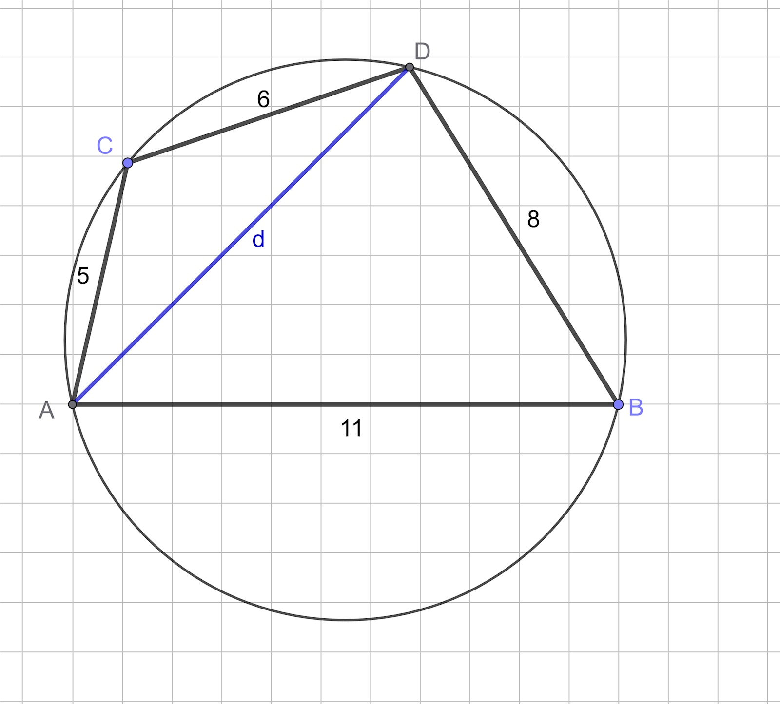 En fyrhörning med sidorna 5, 6, 8 och 11 cm är inskriven i en cirkel. Beräknafyrhörningens area.