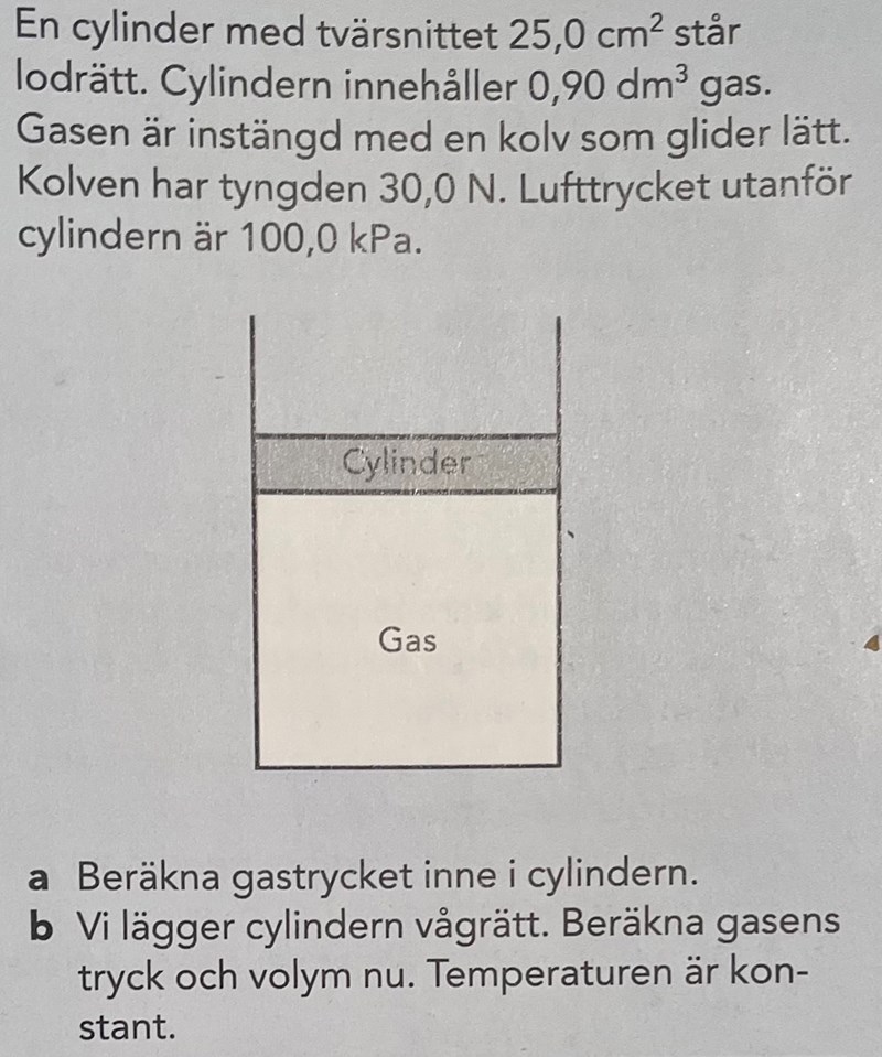 Jag håller på med denna uppgift som du kan se nedan. Jag håller på med uppgift a) just nu. Jag har börjat lösa uppgiften genom att räkna ut trycket från Kolven genom formeln F/A. Däremot vet jag inte hur jag ska beräkna trycket som självaste gasen i behållaren utsätts för. Så jag tjuvkikade i facit och då har de antagit att gasen i behållaren utsätts för lufttrycket 100,0 kPa. Min fråga är nu, varför då? Hur vet man att det är just lufttrycken gasen i behålleren utsätts för? Lufttrycket utanför cylindern var ju 100,0 kPa, men det står inget i uppgiften om att lufttrycket innanför också var det. Så hur har man kunnat anta det?