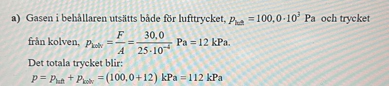 Jag började då att först beräka trycket från kolven genom formeln P = F/A som blev 12 kPa. Sedan ville jag bestäma gasens tryck genom formeln p = T/V för att kunna räkna ut det totala trycket genom att addera trycket från kolven med trycket från gasen. Men detta gick inte då jag endast hade Vgas men inte T. Därför kollade jag i facit och då hade de inte beräknat trycket genom (p = T/V) + F/A, som jag hade tänkt utan de har antagit att gasen i behållaren uttsäts för lufttrycket 100,0 kPa och därför beräknat det totala trycket genom att göra följande: pluft + F/A.