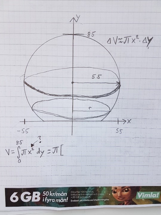 Globen i stockholm kan anses vara ett sfärsiskt segment med höjden 85m och radien 55m, beräkna globens volym.