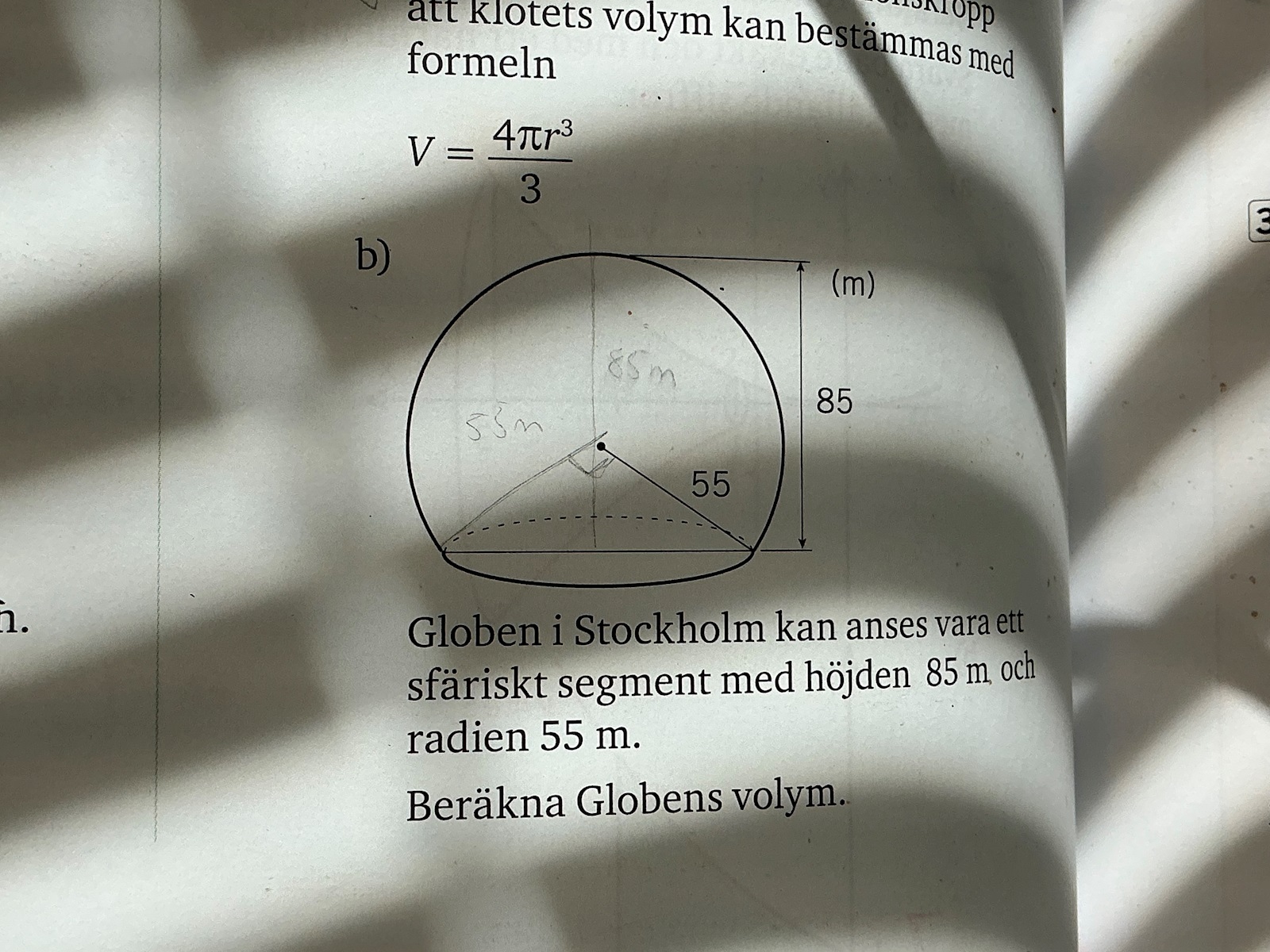 Jag beräknar volymen av ett helt klot med radien 55 meter och låter denna rotera runty axeln. Därefter subtraherar jag denna med volymen av en kon med höjden 30 meter och radien 55 meter. Jag får fel svar. Varför?