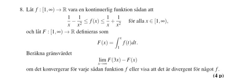 Jag är osäker eftersom f(x) ligger mellan två begränsade funktioner i uppgiften. Men man kan ju sätta in 3x i F(x) och tänka att mha analaysens huvudsats är F(3x)=f(3x), samma sak med F(x). Jag funderar på om man ska använda något med instängningsatsen