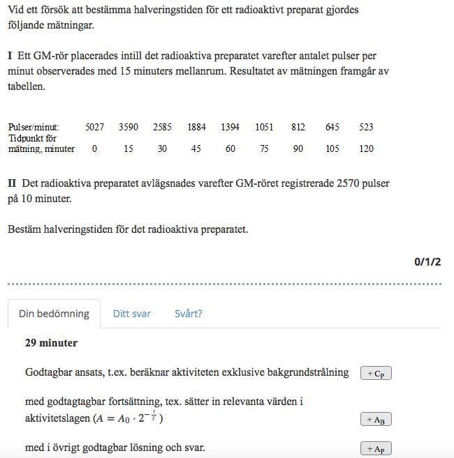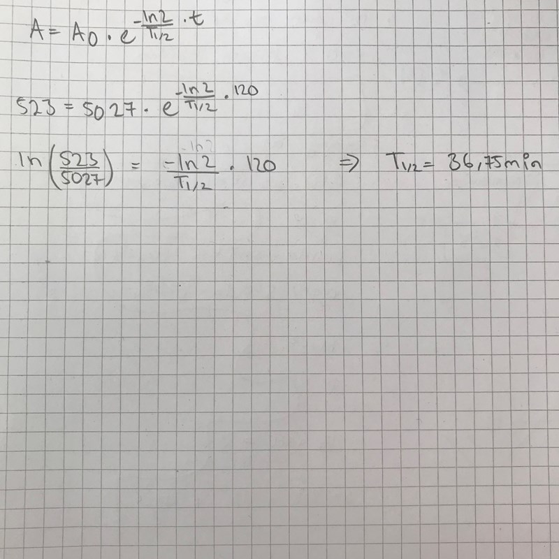 Efter 120 minuter uppmättes 523 pulser per minut. 257 av dessa kommer från bakgrundsstrålningen. Alltså bör 523 - 257 = 266 pulser per minut då komma från preparatet.