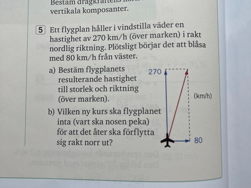 Planet styr mot norr i vindstilla. Då kommer en vind från väster som innebär att planets verkliga kurs blir som röda pilen visar. Hastigheten blir roten ur (2702+802) gissar att det är 343 km/h.