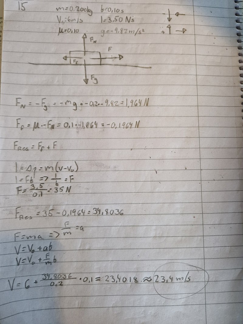 23,5 m/s får man om man struntar i friktionen, och det menas nog att den där impulsen är den totala impulsen, och att man inte ska dra bort friktionsarbetet.