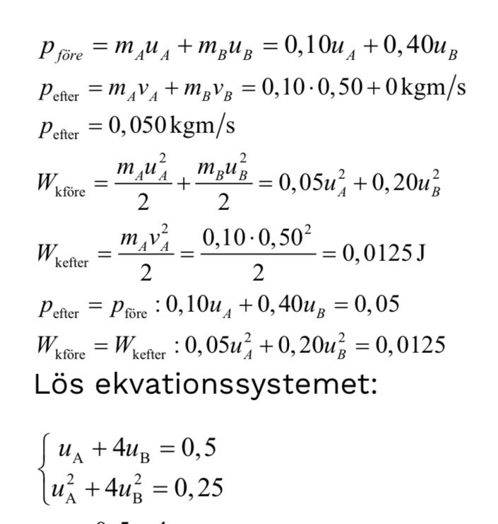 Nedan kan du även se lösningsförslaget. Jag förstår alla steg fram tills det sista då de har ställt upp ett ekvationssystem. Vart försvann upphöjningen av ub2? Och vart kom 4:an som sitter framför ifrån? Nu står det ju 4ub. Varför sitter upphöjningen kvar i ua2, men inte i ub? Och återigen varför sitter det en 4:a framför ua2? Sen undrar jag vart 0,05 som satt framför ua2 försvann och vart 0,20 som satt framför ub2 försvann?