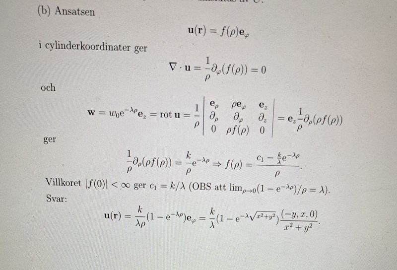 Jag känner tyvärr inte igen detta. Jag förstår inte iden bakom ansatsen och varför u_r=u_z=0 och varför man inför rhof(rho) när man utför rot. Det är många steg i denna lösning som känns inte trivial. Jag hade hoppats på en förståelig förklaring här på PA men det verkar ej som det. Denna uppgift var väldigt olik andra uppgifter där man har en ledning osv. Tack ändå!