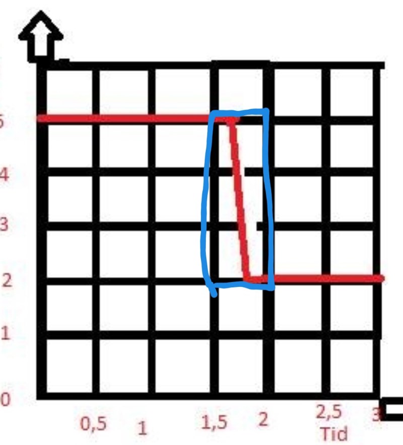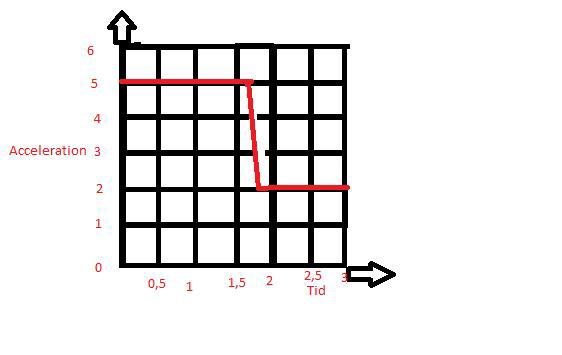 Frågan är hastighetsökningen från start till 2,5s. Svaret ska bli 10m/s. En ruta på tidsaxeln är ju värd 0,5 sek, emedan acc-axeln är värd 1m/s/s. Om jag delar upp det till 3 olika areor är det 1,5x5 för den första, 1x2 för den andra, och för diagonaldelen är det ju då uppskattningsvis 0,5x3/2. Då blir svaret 10,25m/s. Är det avrundningen som (åter) fått mig att fastna i onödan?