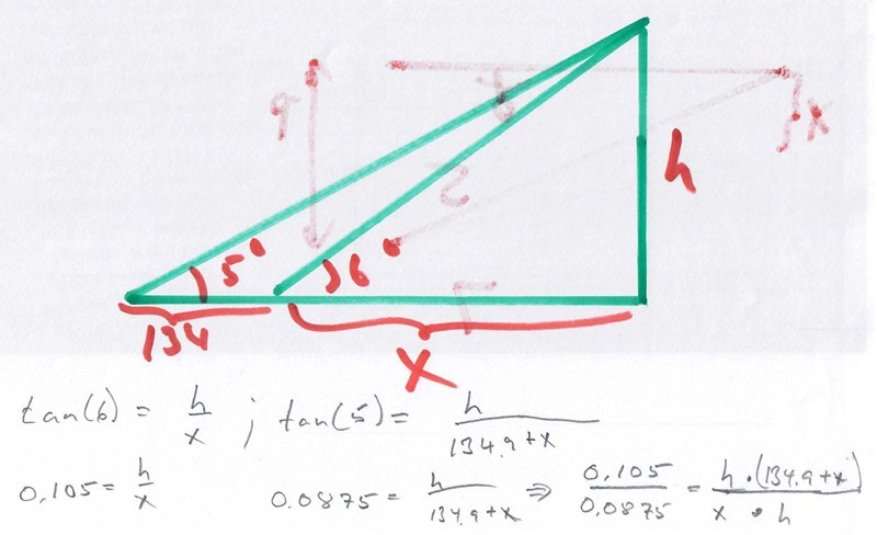 a = 134,9 tan(5)/(tan(6)-tan(5)) = 666,0