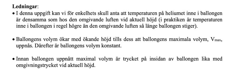 Hej! Jag har fastnat på slutet av en uppgift och kommer inte vidare. Jag ska beräkna ballongens maximala höjd samt tryckskillnaden mellan insidan och utsidan av ballongen vid den höjden. Uppgifterna innan så beräknade jag fram att Lyftkraften är densamma vid 0m, 1000m och 5000 m. Den maximala volymen för ballongen är given som 20 m3 och då fick jag fram att höjden z = 6678 m.