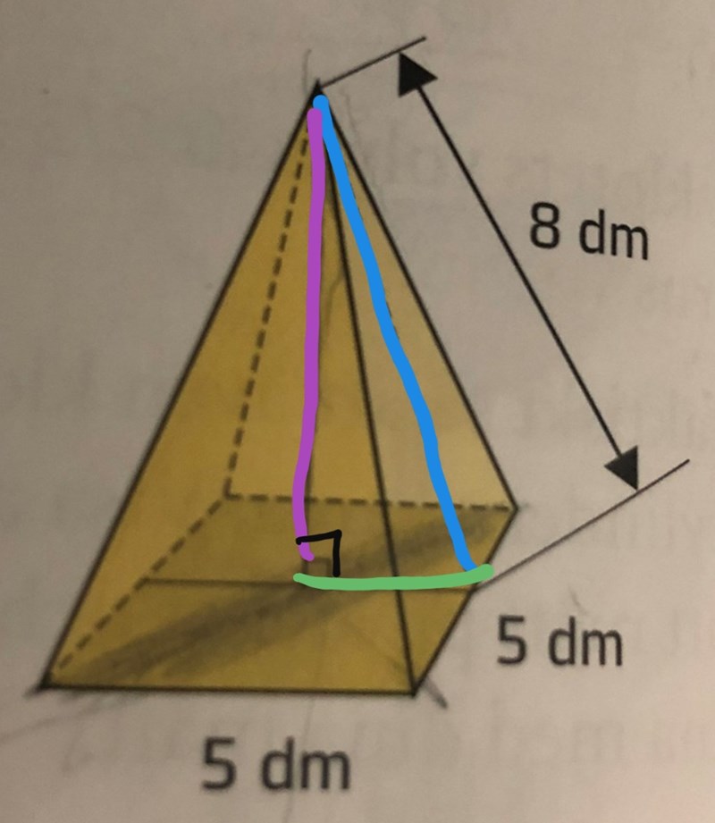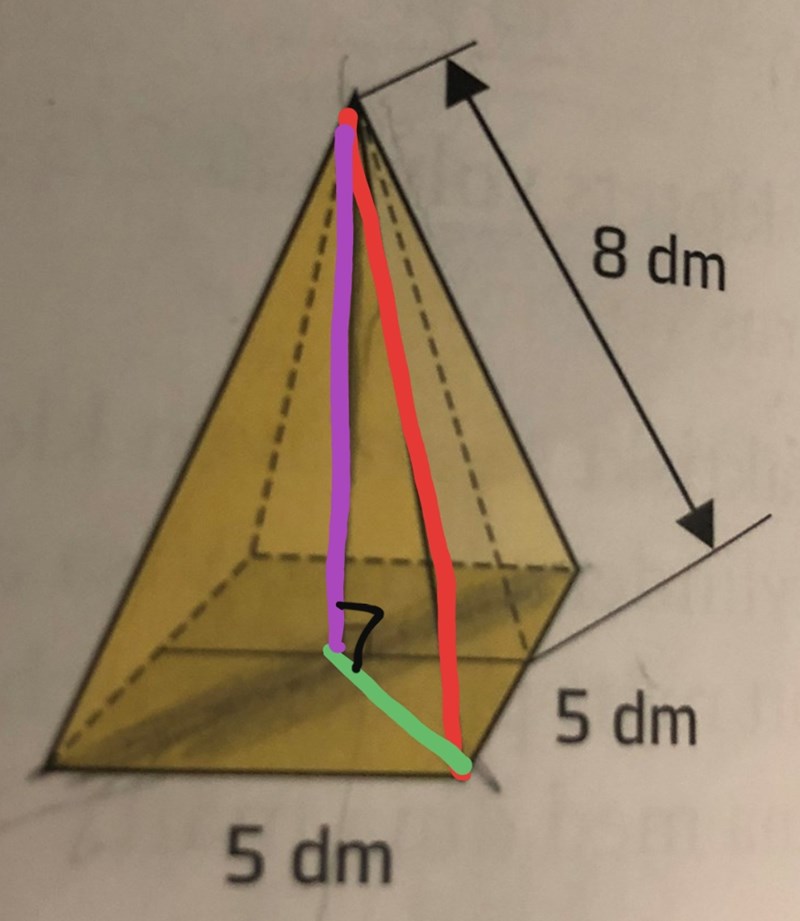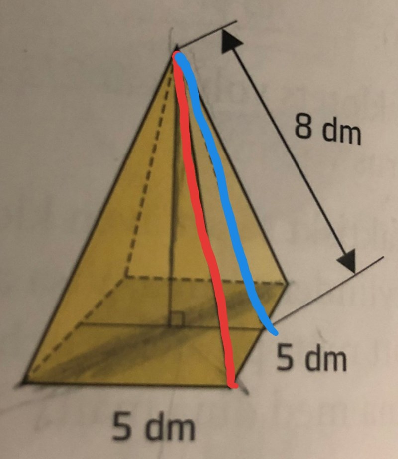 Den metod du använder fungerar om du känner till kantlängden på pyramidens sidytor (röd). Men i den uppgift du visar nu så känner du till höjden på sidytan (blå).