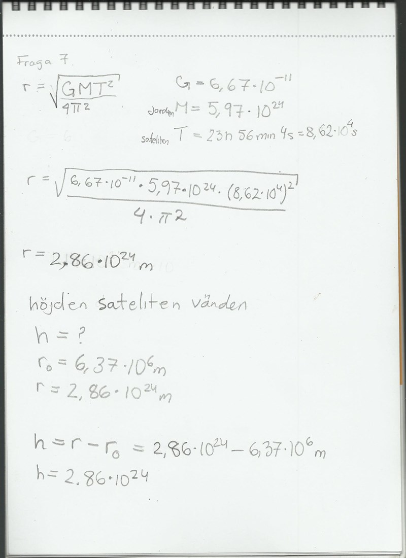 jag fick veta bara "En satellit skjuts upp lodrätt. När den har nått höjden 1 jordradie så har den hastigheten 4 jordradier per timme. Därefter tillförs ingen mer energi för att lyfta den. Den påverkas nu bara av gravitationen från jorden".