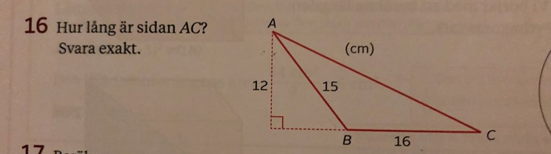 Det är sträckan BC som är 16 cm, så du kan inte använda Pythagoras sats där.